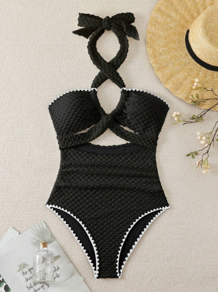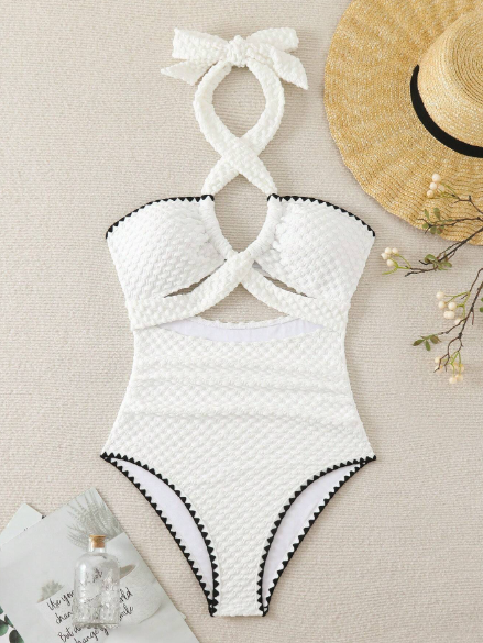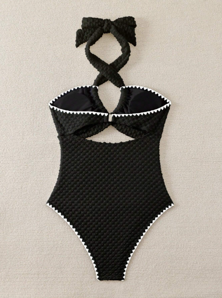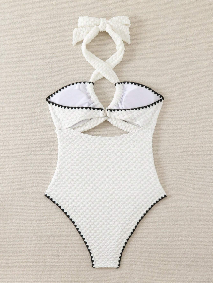 Um clássico reinventado! A cor atemporal é realçada pelo tecido texturizado luxuoso e o acabamento contrastante nas bordas. O design possui um sofisticado detalhe de amarração halter (no pescoço) que se transforma em um laço, além de recortes que modelam a silhueta. É a escolha perfeita para um visual poderoso e chique à beira-mar.