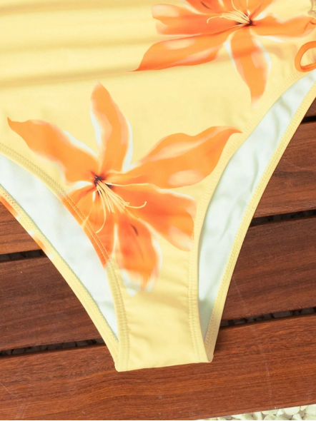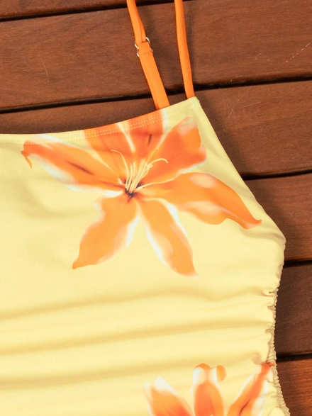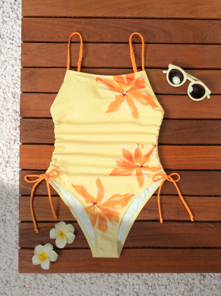 Radiante como o pôr do sol! A cor amarela suave serve de tela para uma estampa floral vibrante em tons de laranja. O modelo apresenta alças finas contrastantes e franzidos laterais ajustáveis por amarração, permitindo que você controle a altura da cava e o caimento no corpo. É a peça ideal para quem busca um visual luminoso e confortável.