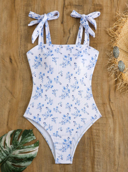 Frescor e delicadeza em uma única peça! Este maiô branco canelado é coberto por uma charmosa estampa floral em tons de azul, lembrando a beleza da porcelana portuguesa. O corte quadrado do decote e as alças ajustáveis que se amarram em laços nos ombros conferem um toque romântico e clean. Ideal para quem ama o estilo cottagecore na moda praia.